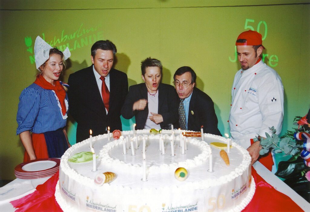 Der Neuanfang war gemacht. Ab 1949 zeichneten die „landeseigenen Berliner Ausstellungen“ für die Messe verantwortlich. 1950 fiel die „Grüne Woche“ wegen größerer Bauarbeiten aus. Die Internationalität der „Grünen Woche“ nahm ihren Lauf, als 1951 ein offensichtlich weit vorausschauender Aussteller aus Holland appetitliche Gemüsepyramiden dem staunenden Publikum offe-rierte. Sie lösten auch bei Bundeskanzler Konrad Adenauer Bewunderung aus. Danach nahm die Beteiligung ausländischer Aussteller in den kommenden Jahren kontinuierlich zu.